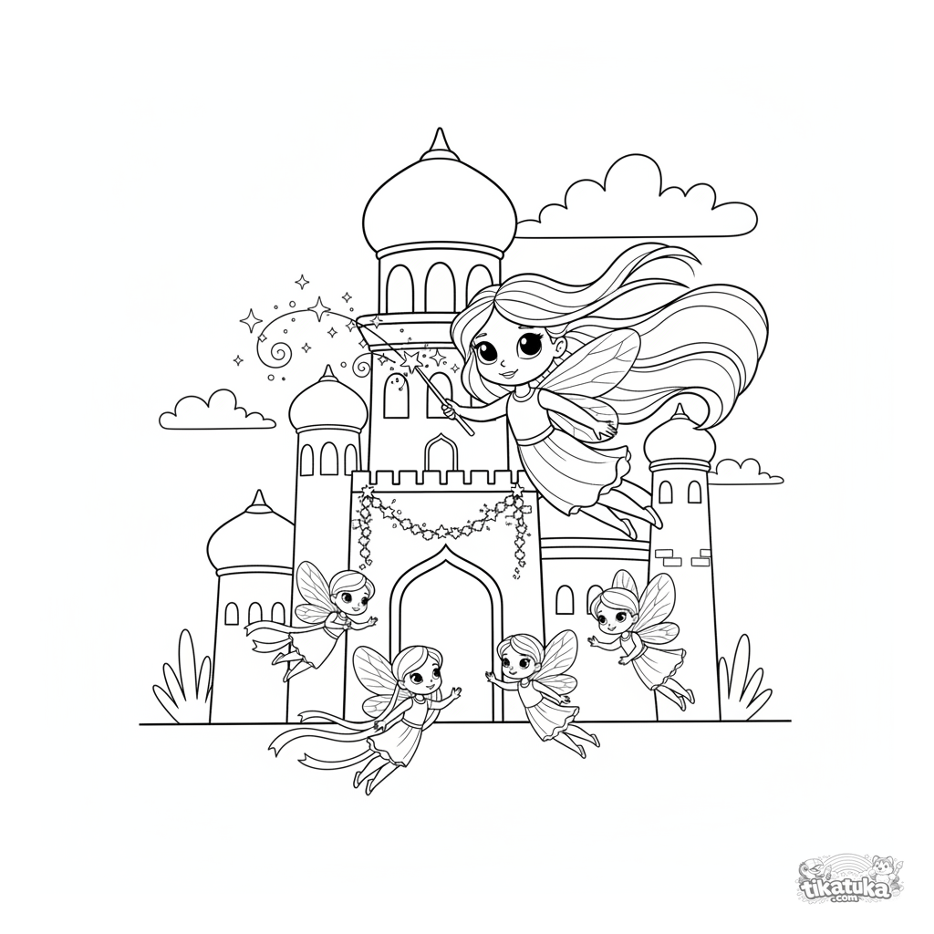 Página para colorear para niños de 4-6 años en estilo cuento: hadas decoran mágicamente un palacio del desierto. Líneas gráciles y una escena fantástica.