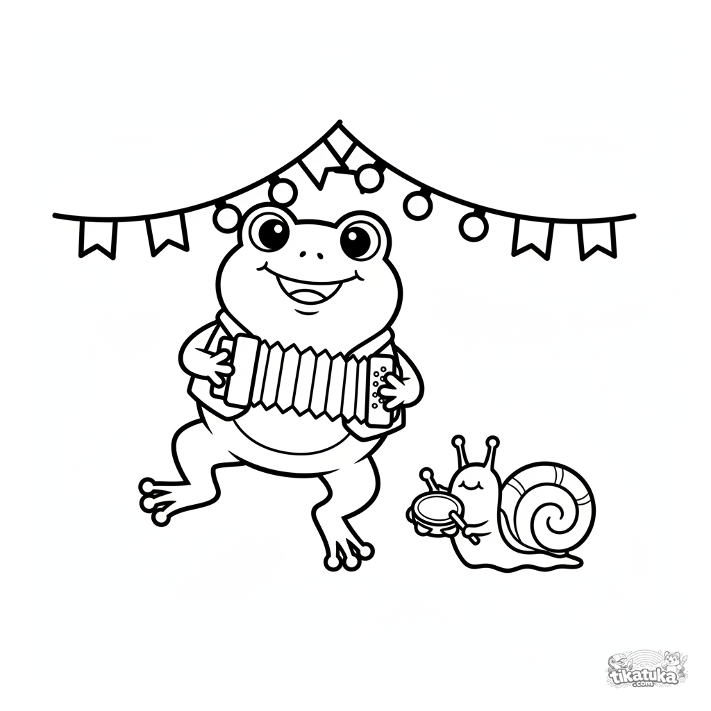 Página para colorear simple para niños pequeños de 3-5 años: una alegre rana con chaleco baila y toca el acordeón en un césped de festival. Formas grandes y claras.