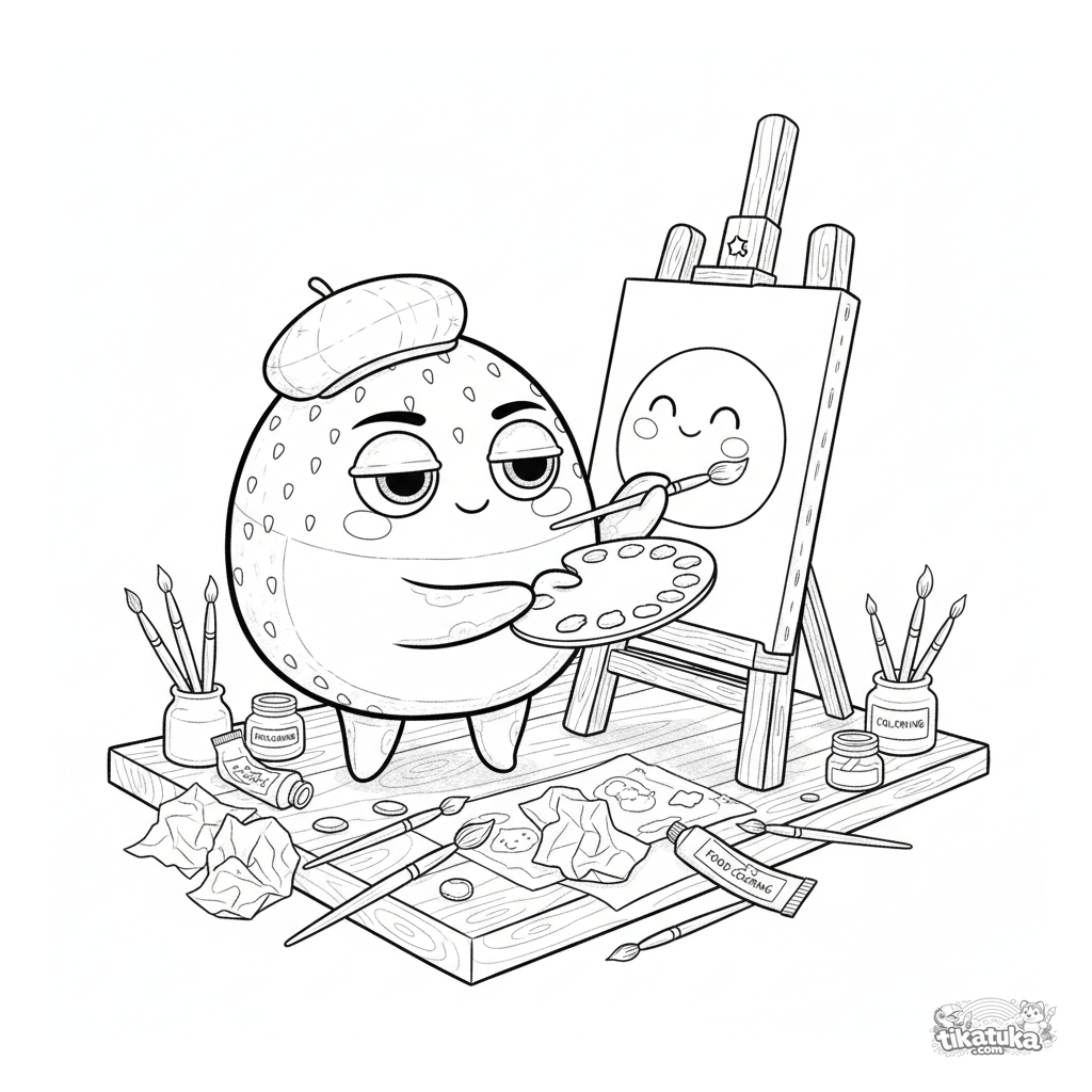 Página para colorear compleja: un mochi artista de fresa pintando un cuadro en su estudio. Escena detallada en estilo acuarela para niños mayores de 10-12.