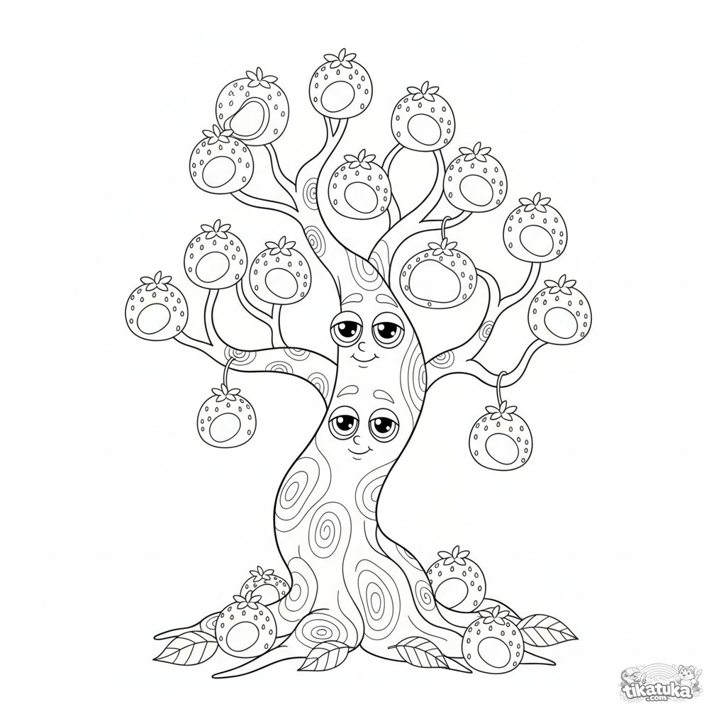 Página de fantasía para colorear: un árbol mágico donde crecen mochi de fresa. Escena detallada con tronco, ramas y dulces cayendo para 10-12 años.