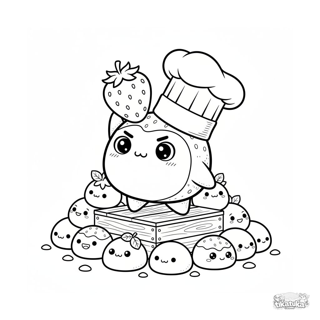 Página para colorear de un chef mochi equilibrando una fresa. Escena detallada para niños de 7-9 años.