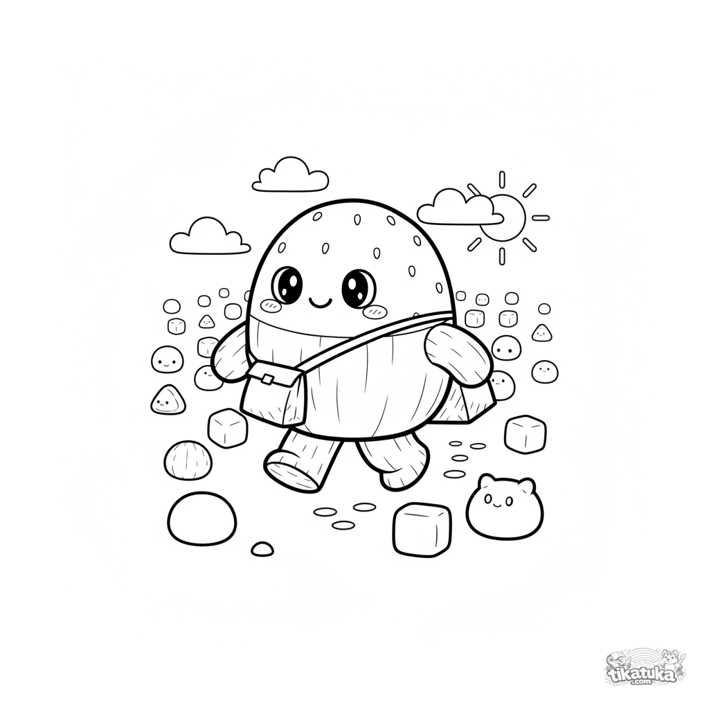 Página para colorear: un mochi de fresa repartidor marcha por un campo de mochi. Escena dinámica estilo juguete para 7-9 años.