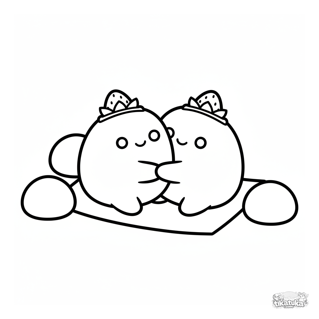 Página para colorear para niños pequeños: dos lindos mochi de fresa abrazándose en una hoja de papel de arroz entre otros mochi. Formas simples y márgenes amplios.