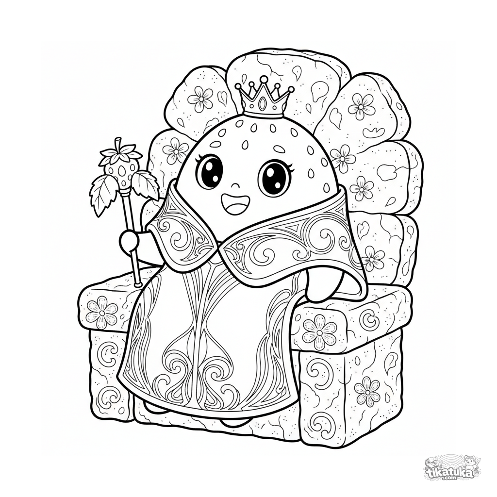 Página para colorear detallada estilo art nouveau: una reina mochi de fresa en un trono de galletas. Para 10-12 años, elementos decorativos intrincados.