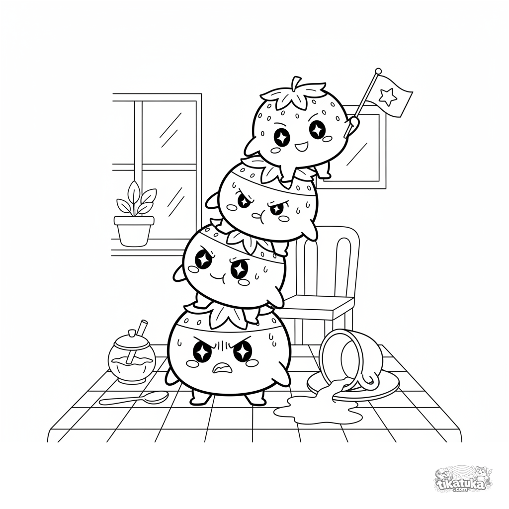 Página para colorear de una torre de mochis de fresa equilibrada en una mesa. Escena divertida e inestable estilo cartoon 90 para niños de 4-6 años.