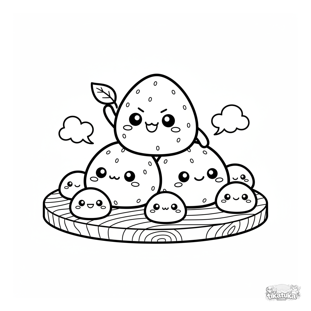 Página para colorear de tres mochi de fresa en equilibrio entre otros dulces. Escena linda para niños de 4-6 años.