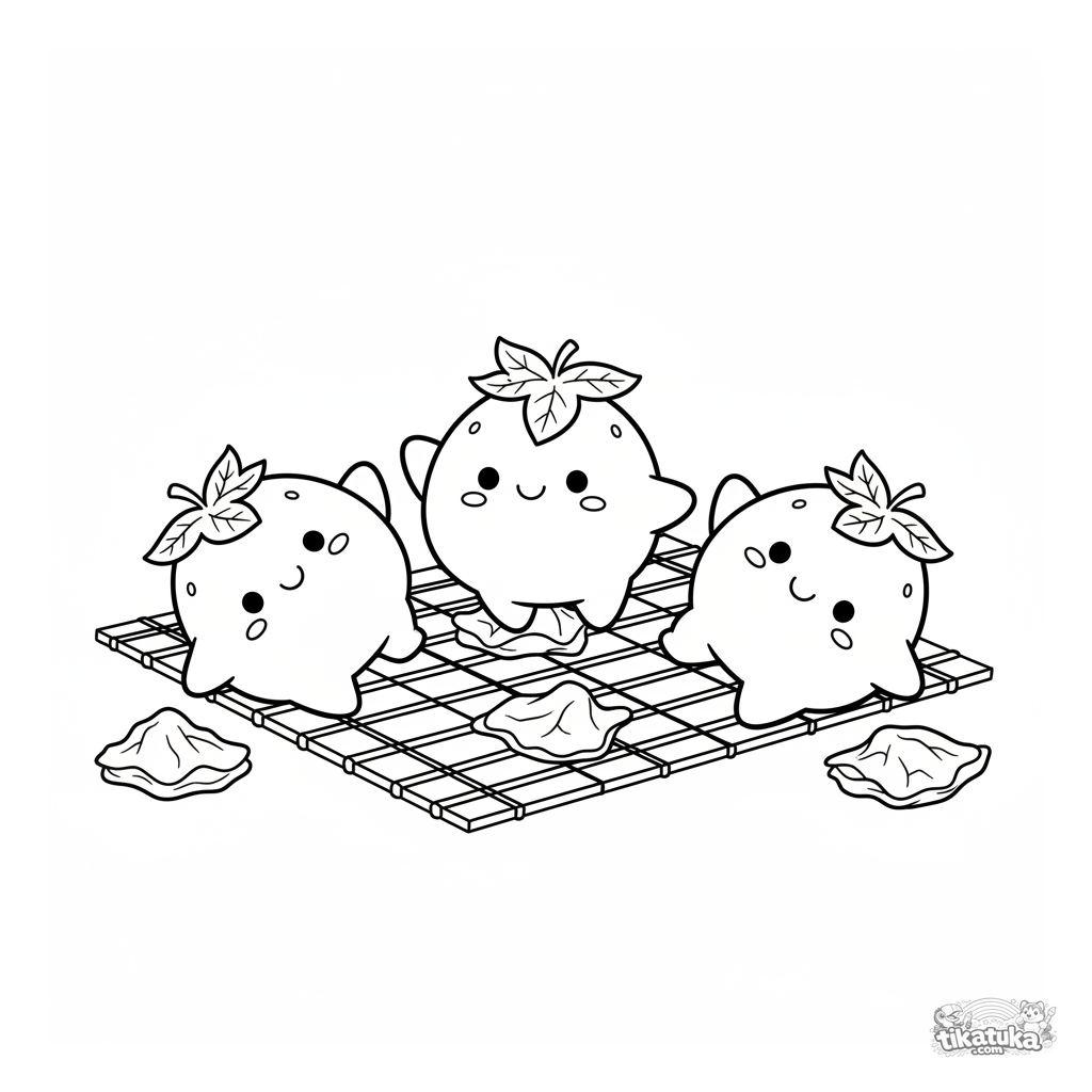 Página para colorear con tres lindos mochi de fresa balanceándose. Estilo kawaii para niños 4-6. Imprimible gratis.