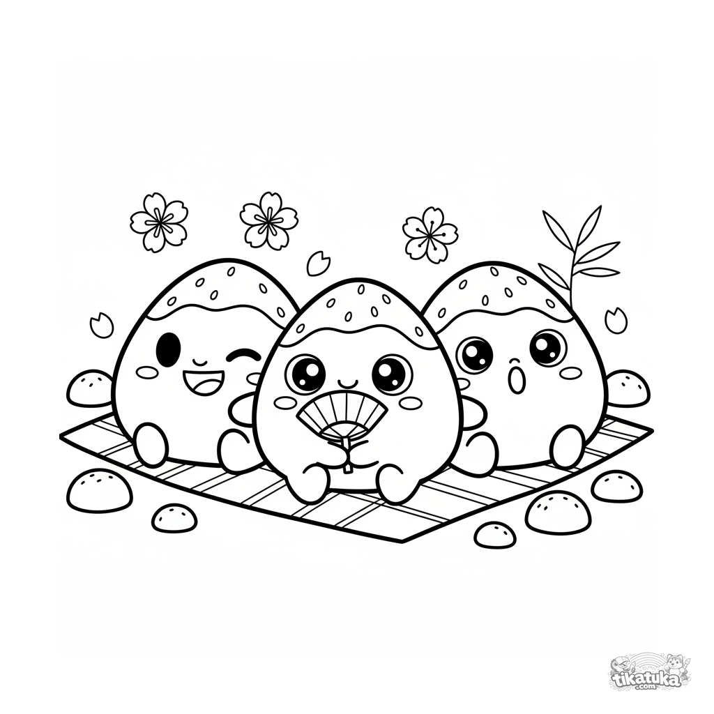 Página para colorear con tres mochi de fresa para niños de 4-6 años. Lindos postres en estera de bambú celebrando.