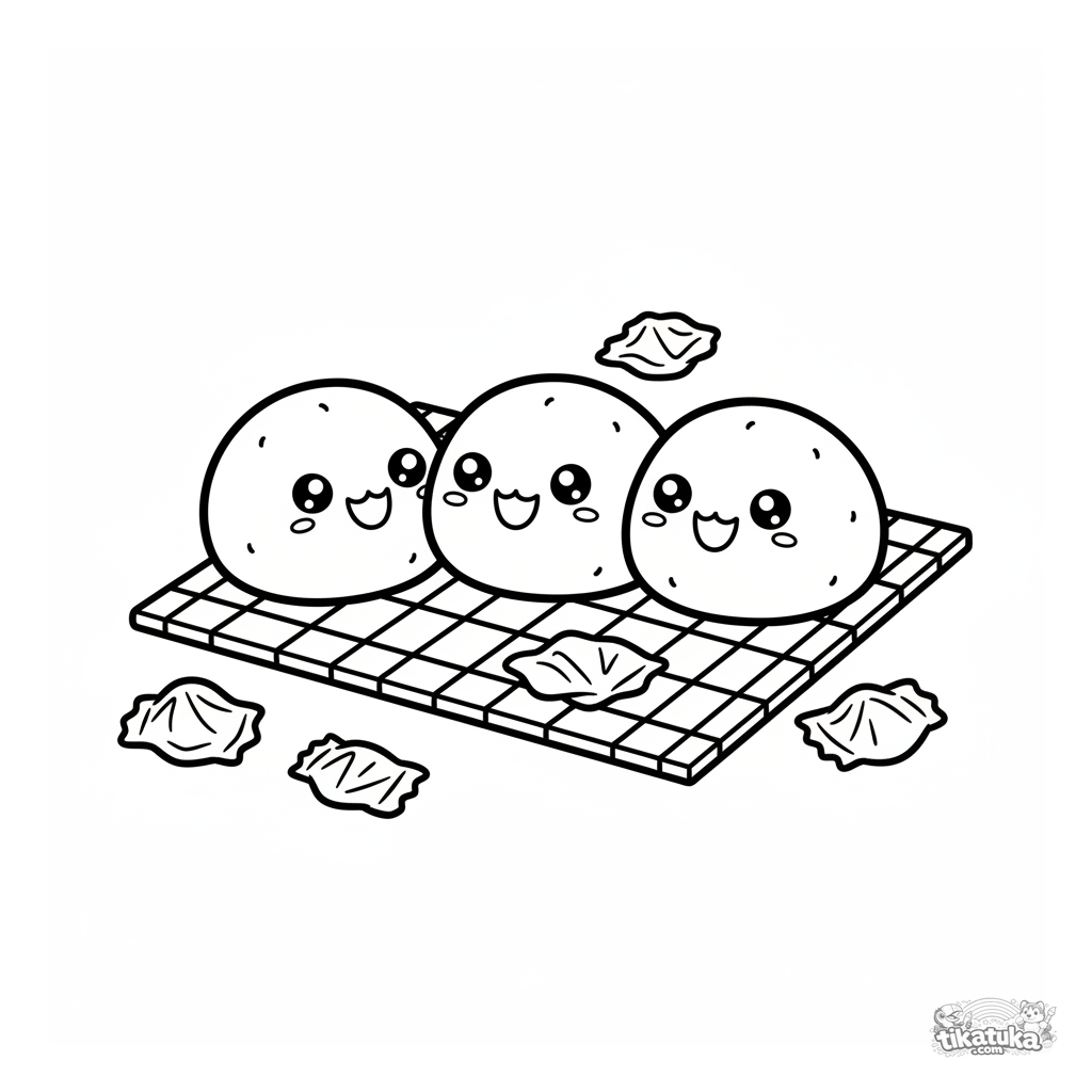 Página para colorear para niños pequeños: tres lindos mochi de fresa en una estera de bambú. Formas simples y márgenes amplios.
