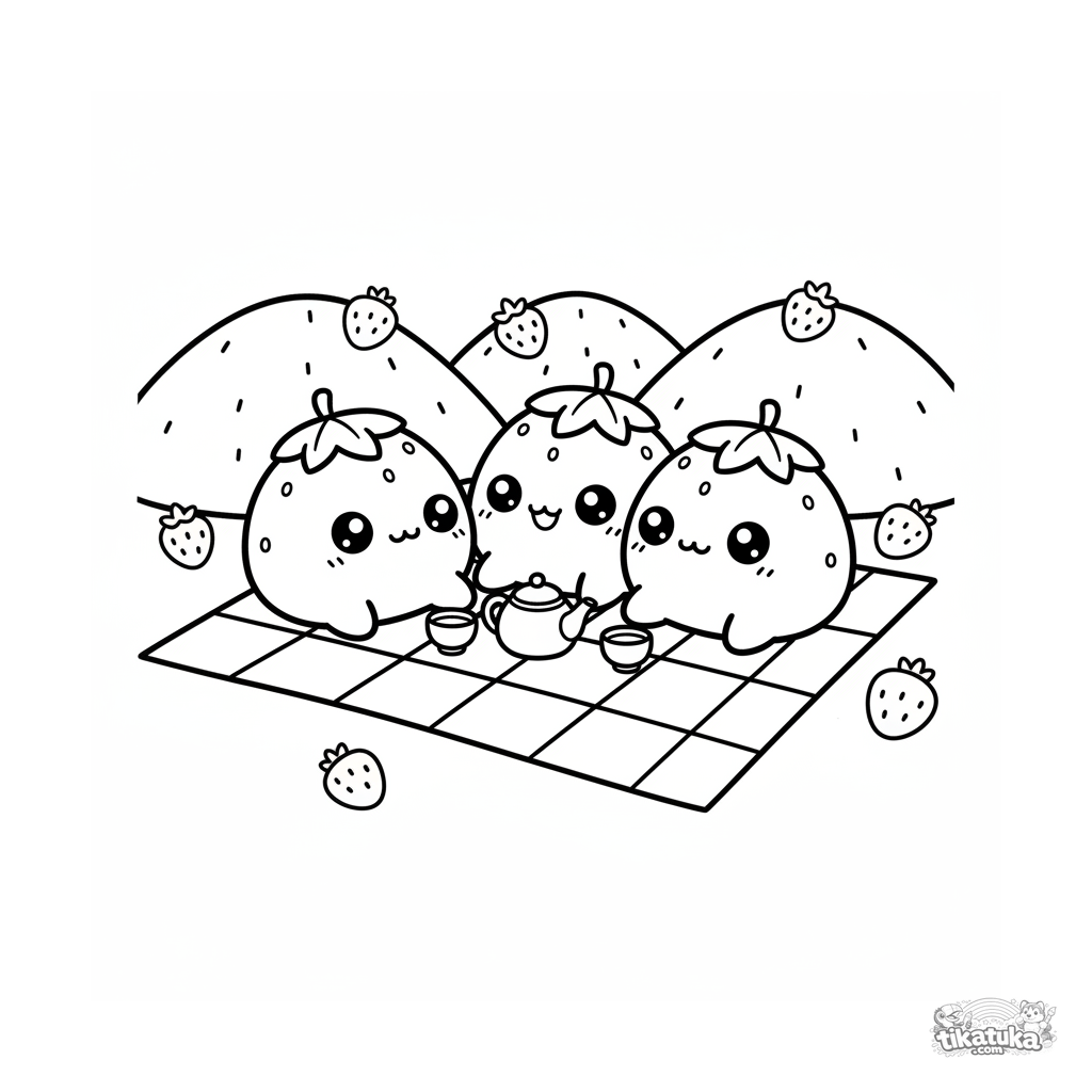 Página para colorear de tres mochi de fresa en un picnic. Escena adorable para niños de 4-6 años.