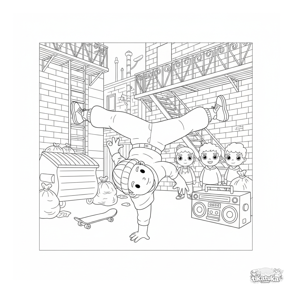 Página para colorear detallada: un bailarín callejero realiza un movimiento de breakdance en un callejón urbano con paredes de ladrillo y amigos al fondo. Para niños de 7 a 12 años.