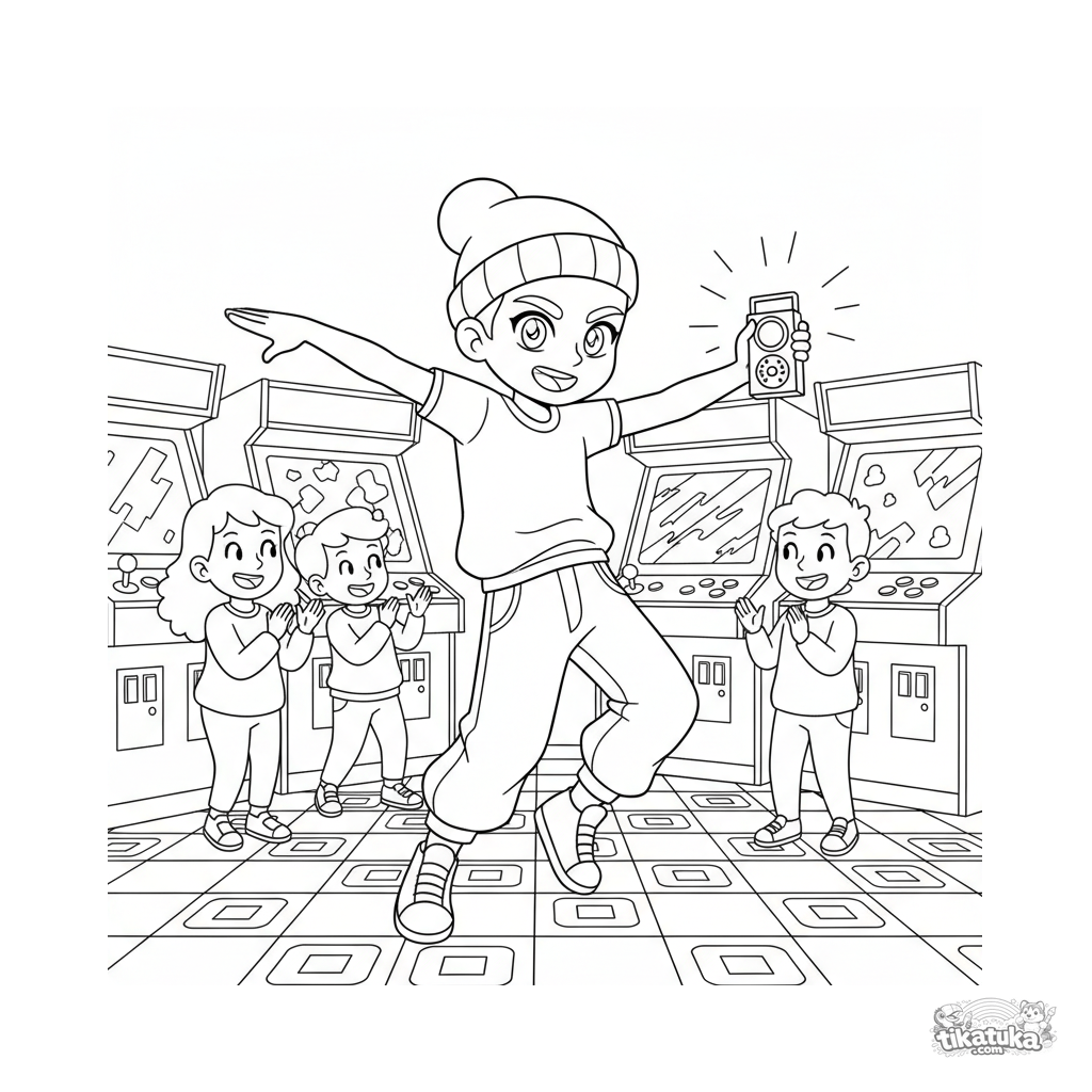 Página para colorear para niños de 7-12 años: un bailarín callejero en pleno movimiento en un rincón de sala de arcade, con público y pantallas.