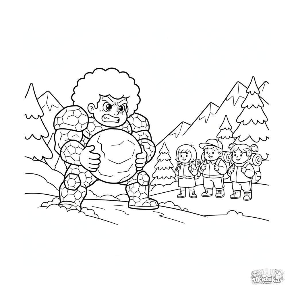 Página para colorear para preadolescentes 7-9: un héroe fuerza en armadura de roca despeja un sendero levantando una roca gigante en una montaña nevada.