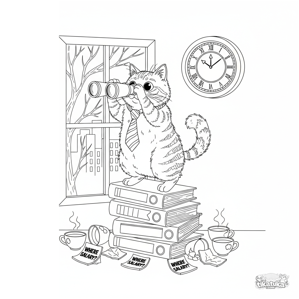 Página para colorear detallada para niños 10-12: un gato de oficina estresado en una torre de carpetas intenta ver su salario con prismáticos. Meme divertido y detallado con tazas de café y notas.