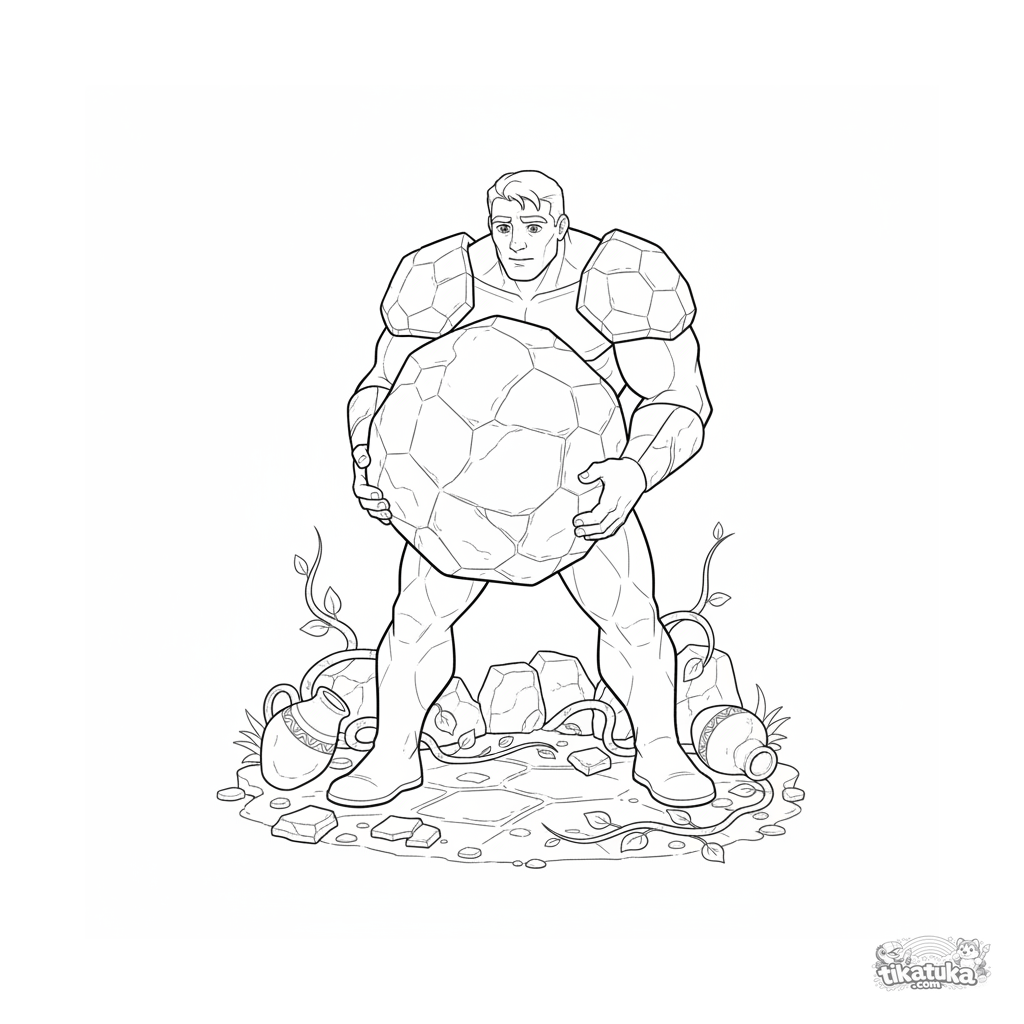 Página para colorear para 10-12 años: un superhéroe de fuerza con armadura de piedra levanta una roca para despejar un camino en ruinas antiguas. Escena realista y detallada.