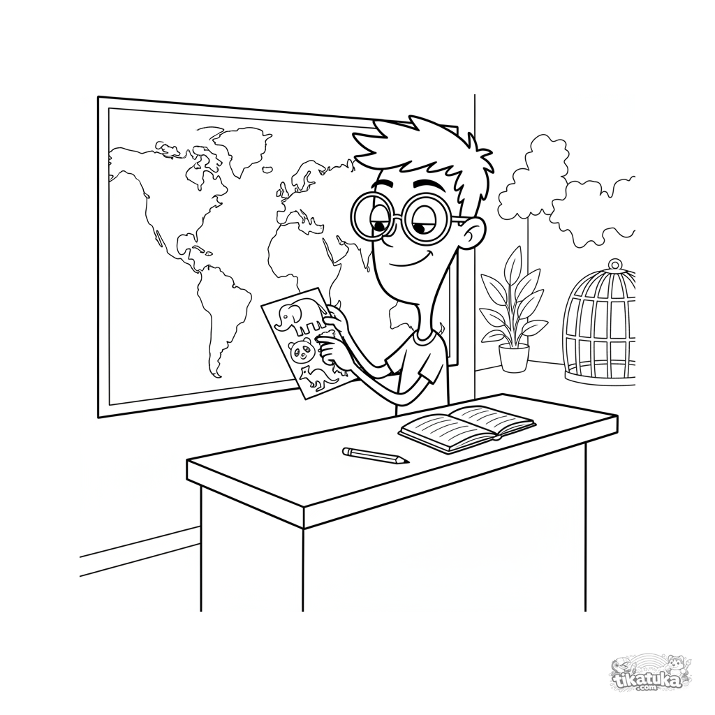 Página para colorear para preadolescentes de 7-9 años: un estudiante colocando pegatinas de animales en un mapa mundial en blanco en el centro educativo del zoológico. Escena educativa de geografía.
