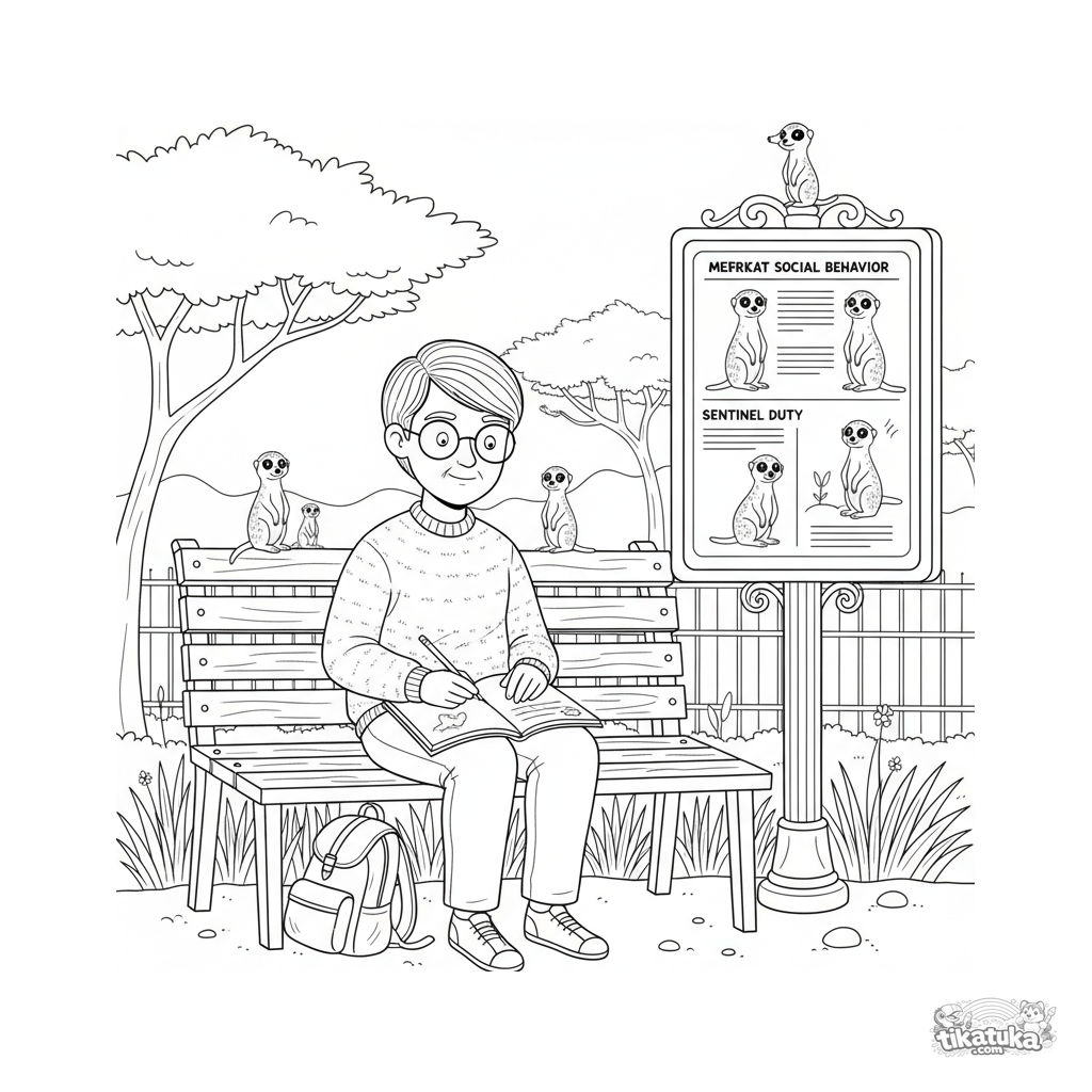 Página para colorear para 10-12 años: un estudiante dibuja de un cartel informativo sobre el comportamiento social del suricato en el zoológico. Escena educativa detallada.