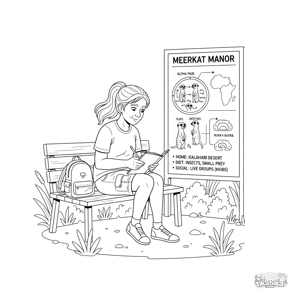 Página para colorear detallada para niños 10-12 años. Un estudiante con un cuaderno de dibujo copia un tablero informativo con un diagrama familiar de suricatas.