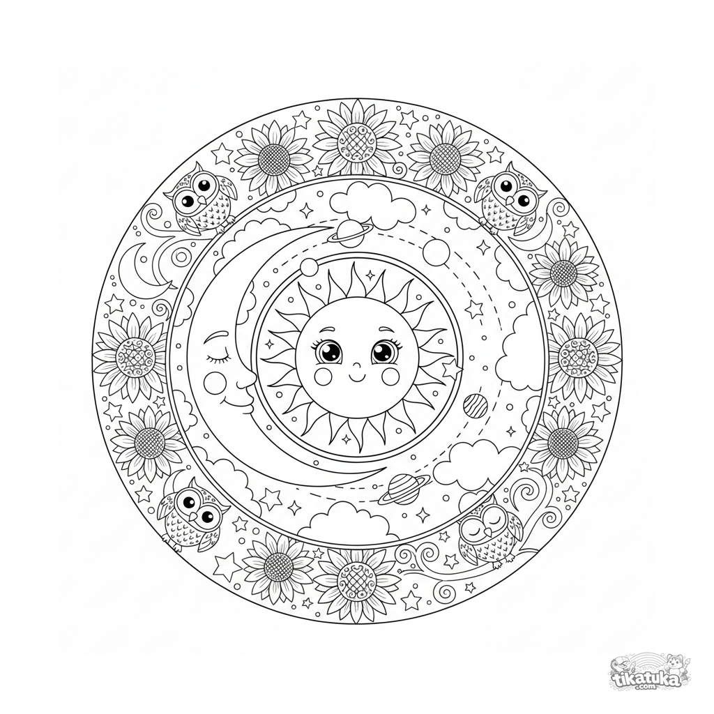 Página para colorear de mandala celestial sol y luna para 10-12 años. Cara sonriente del sol, luna creciente, planetas en órbita, búhos y girasoles, simétrico.