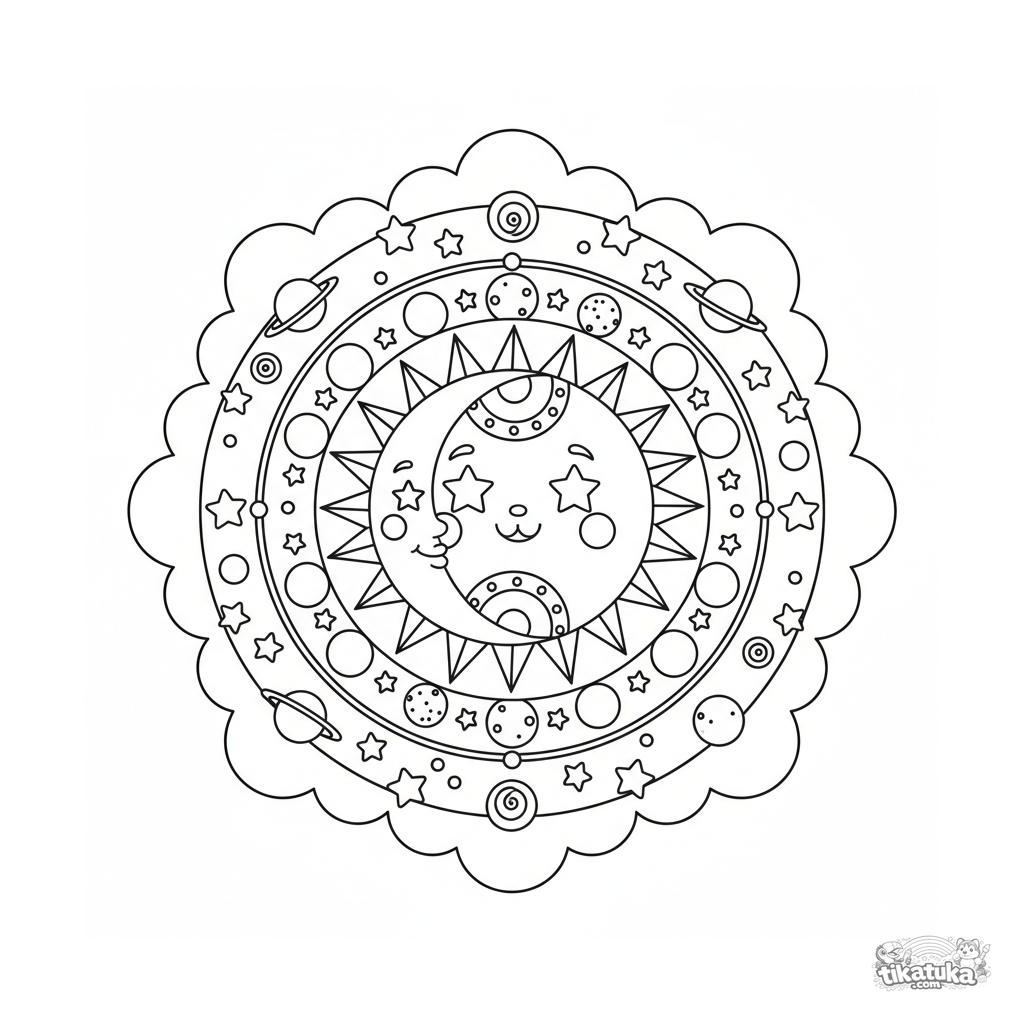 Página para colorear de mandala celestial intrincada que une el sol, la luna y los planetas. Un diseño cósmico geométrico en estilo constructivista para niños de 10 a 12 años.