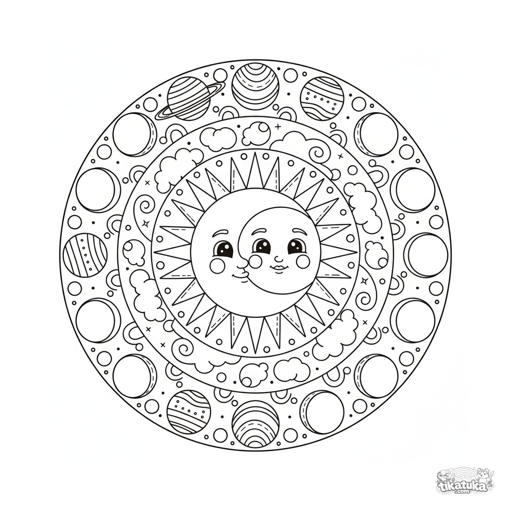 Mandala celestial detallada para colorear, para 10-12 años. Centro de sol y luna, anillos de rayos, nubes, estrellas, planetas y fases lunares.