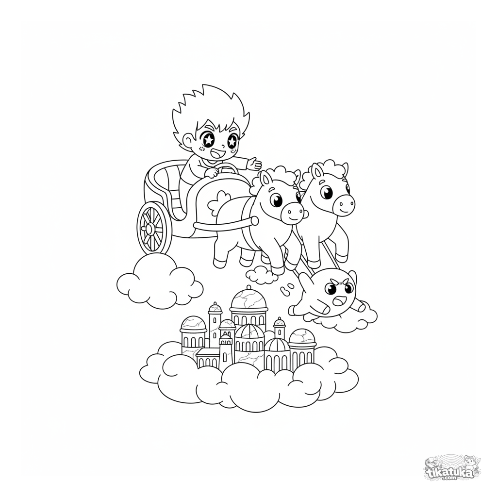 Página para colorear para niños: un conductor alegre en un carro solar ayuda a espíritus de las nubes. Escena dinámica y amable, adecuada para niños de 5 a 9 años.