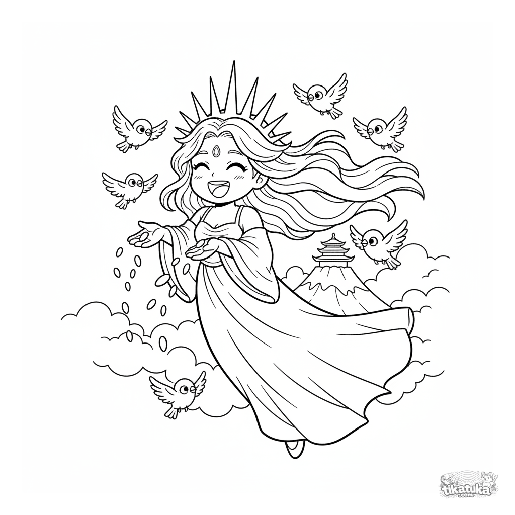 Página para colorear para niños: una diosa del sol vuela por el cielo con compañeros gorriones sobre un templo de montaña. Escena brillante y alegre de mitos.