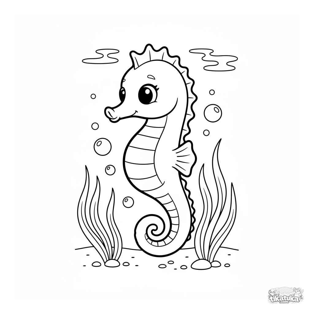 Página para colorear de un caballito de mar bailando en rayos de sol entre pasto marino en aguas poco profundas. Para niños de 4-6 años.