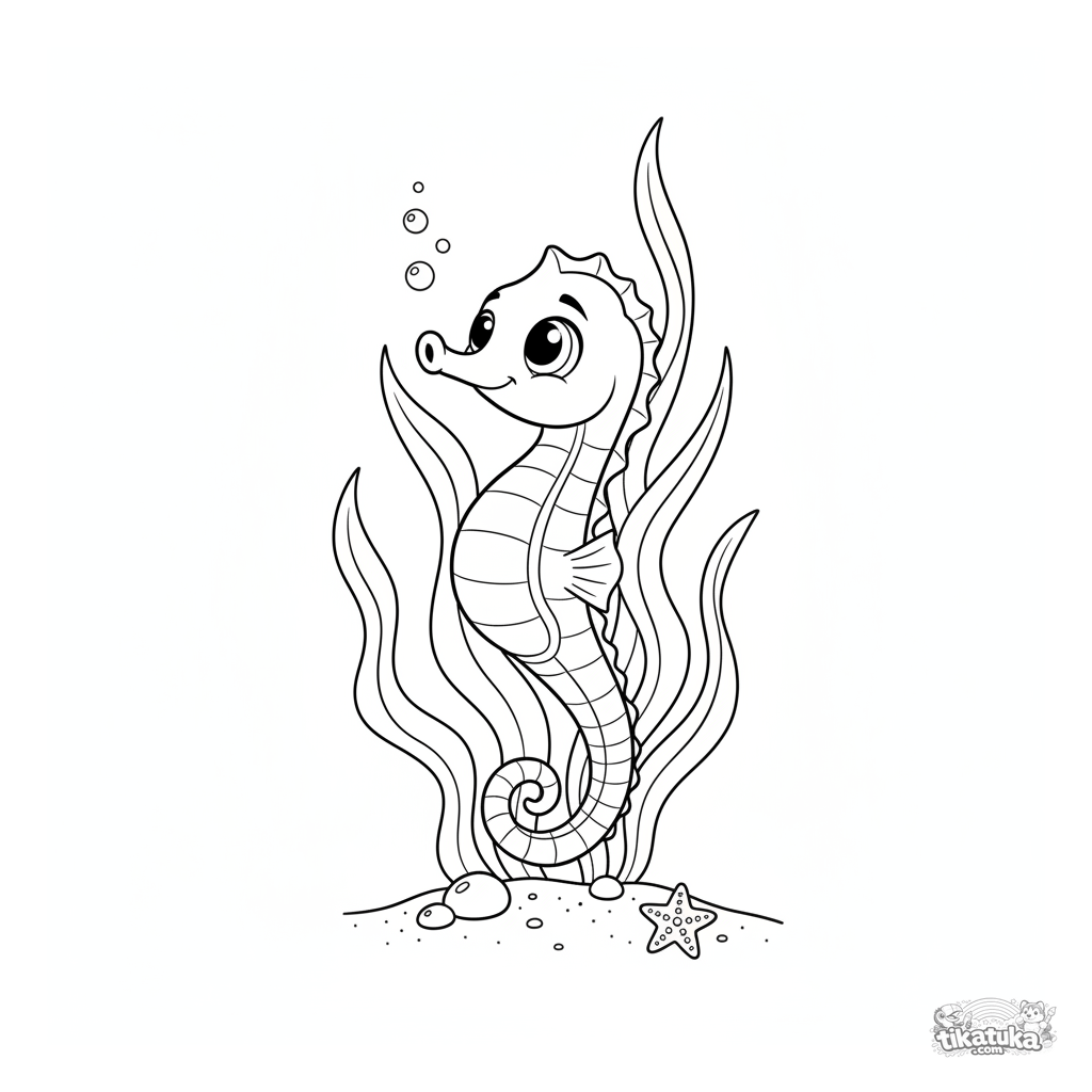 Página para colorear para niños 4-6: un caballito de mar se engancha en algas en aguas poco profundas iluminadas por el sol.