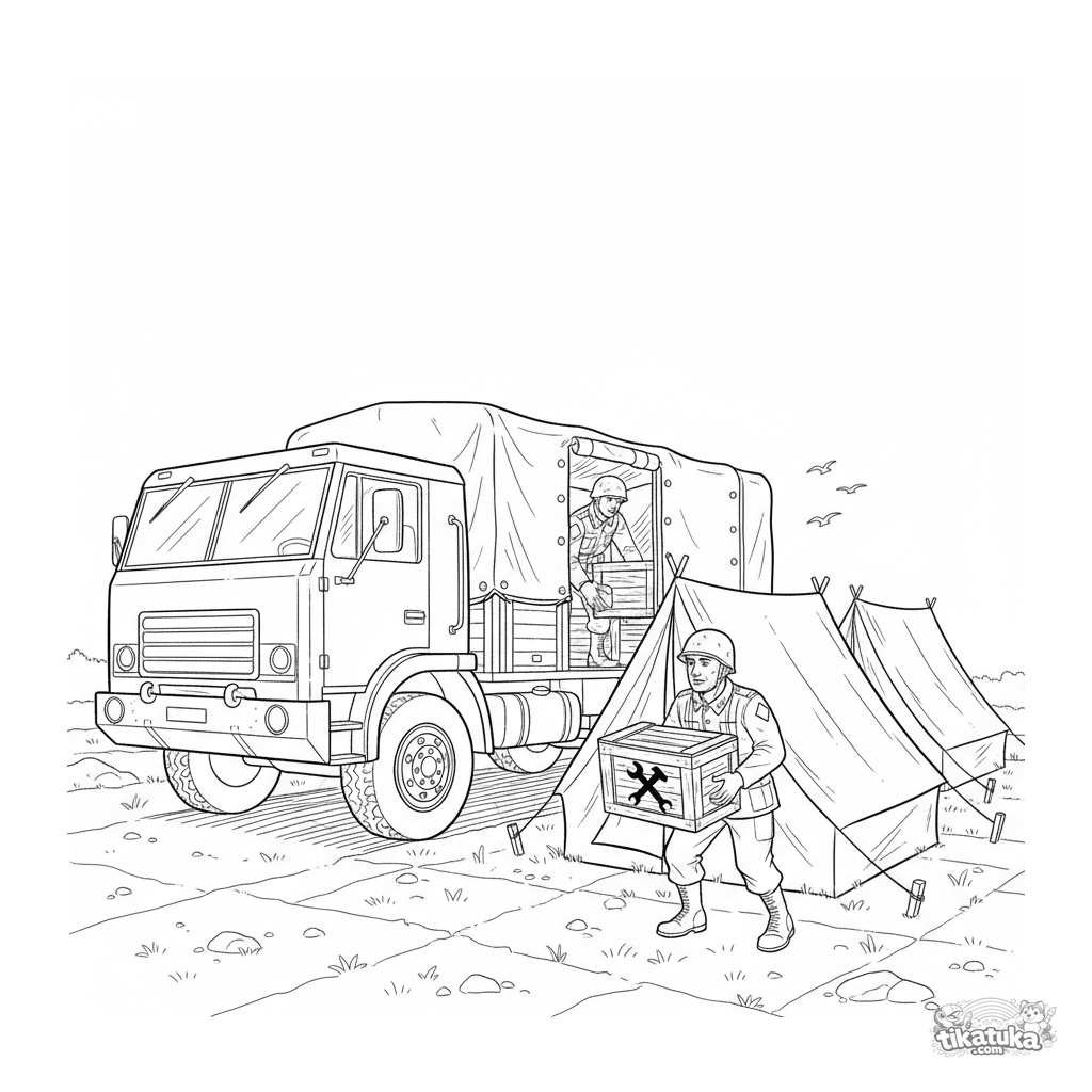 Página para colorear detallada para 10-12 años: un camión militar de suministros descargando en un cuartel general de campo. Soldados pasan una caja.
