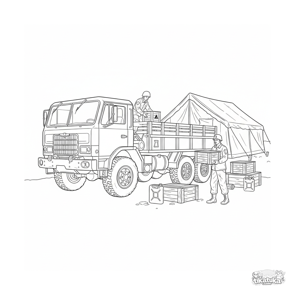 Página para colorear de un camión militar descargando suministros en el cuartel de campo. Para niños mayores de 10-12 años. Ilustración detallada del vehículo, cajas, tiendas y soldados.