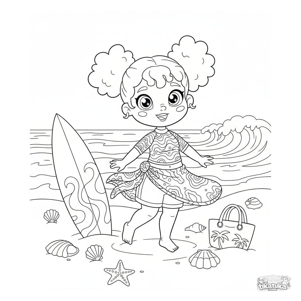 Página para colorear vibrante para niñas 10-12: una chica surfista en ropa de playa girando alegremente en la orilla. Tabla de surf, conchas marinas y ropa detallada.