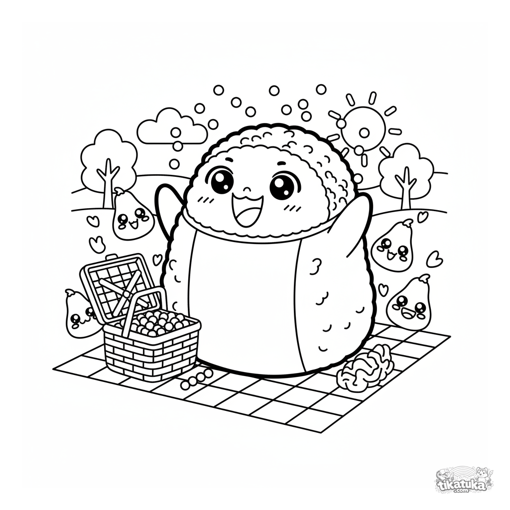 Página para colorear de un rollo de sushi celebrando junto a una cesta de picnic, lanzando huevas de pescado. Para niños de 4 a 6 años. Con alga nori, arroz, sobres de salsa de soja y jengibre.