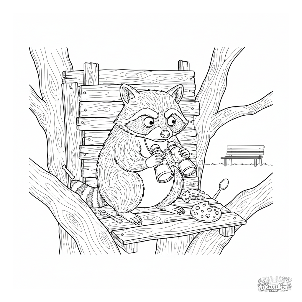 Página para colorear para niños 10-12: un mapache sospechoso en una casa del árbol del parque espía con binoculares un banco. Meme detallado con humor y fondo.