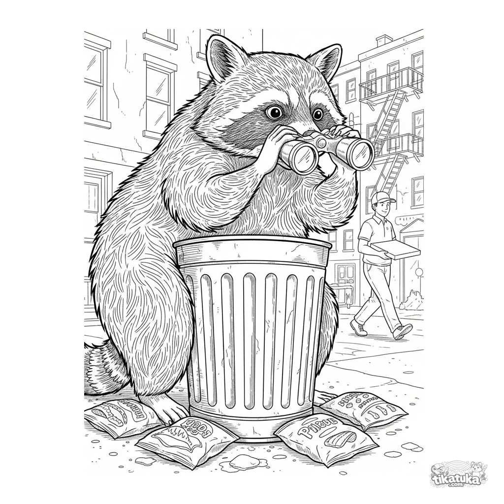 Página para colorear para niños 10-12: un mapache sospechoso en un contenedor con prismáticos, vigilando un reparto de pizza en un callejón.