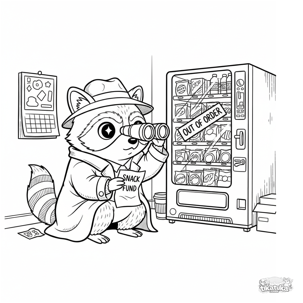Página para colorear compleja estilo novela gráfica para niños de 10-12 años: un mapache espía sospechoso en trench acecha una máquina expendedora rota. Meme gracioso con estética noir.
