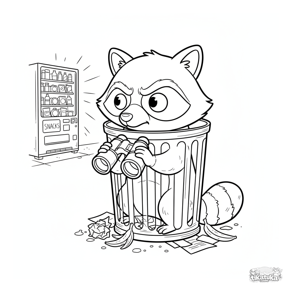 Página para colorear para niños 10-12: un mapache sospechoso asomándose de un contenedor en un callejón, agarrando unos prismáticos. Escena detallada en estilo novela gráfica.