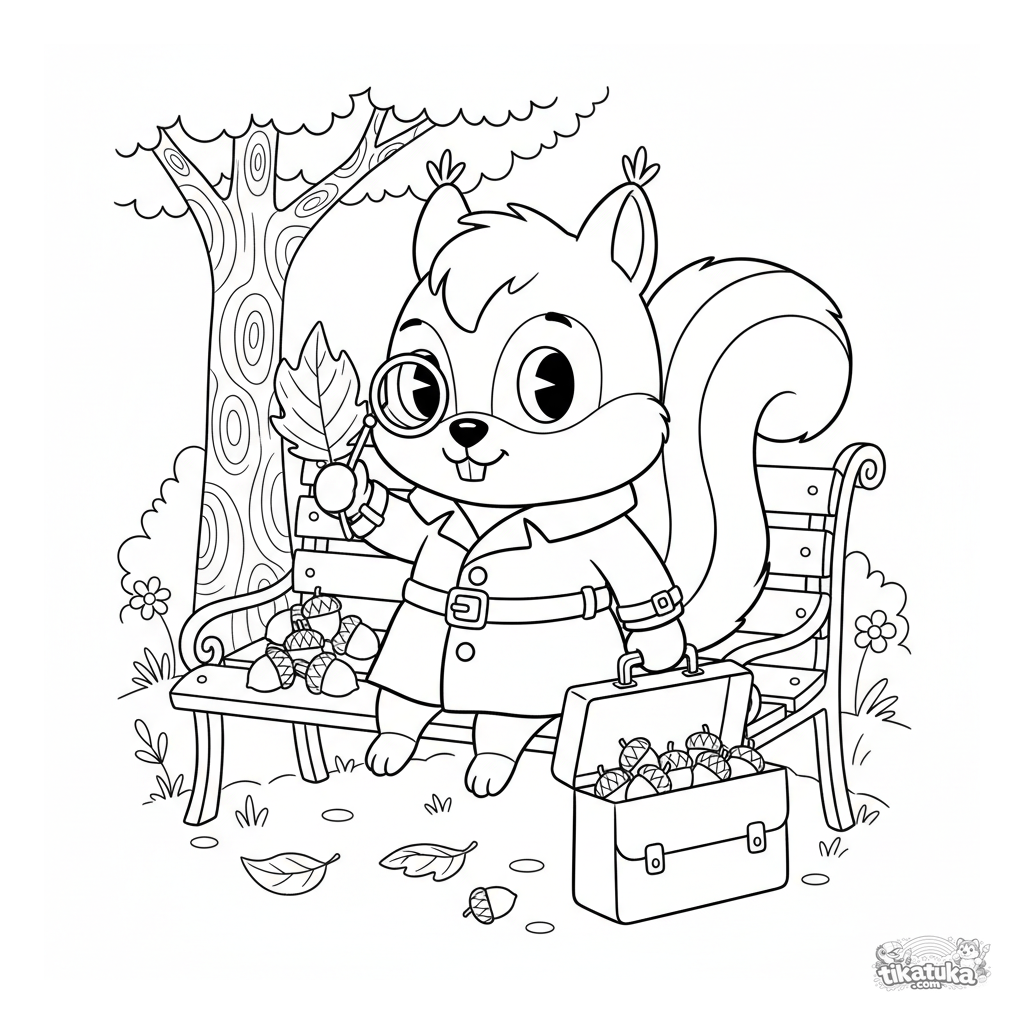 Página para colorear en estilo retro: una ardilla sospechosa en trenca y monóculo en un banco del parque examina una hoja. Meme absurdo y detallado para niños 10-12.