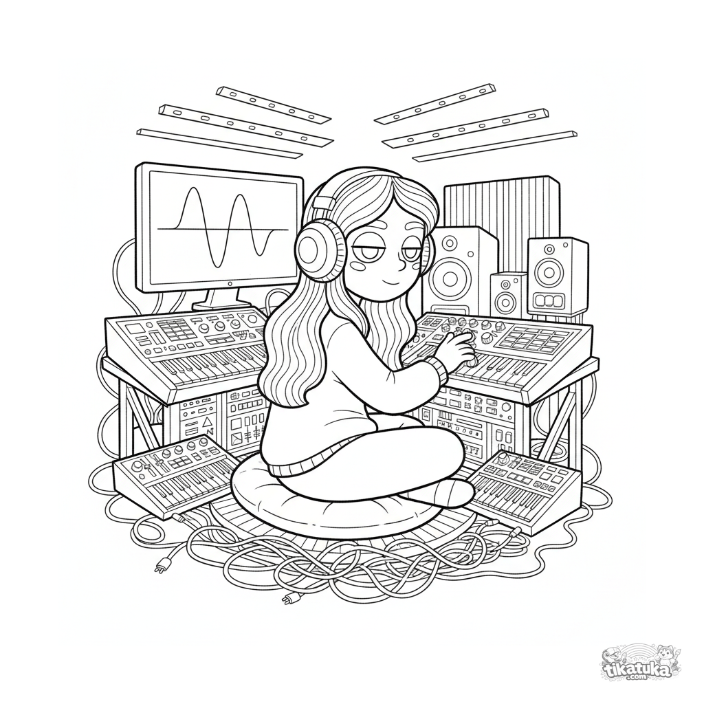 Página para colorear para preadolescentes: un productor de música electrónica en un estudio del sótano, rodeado de sintetizadores. Escena dinámica.