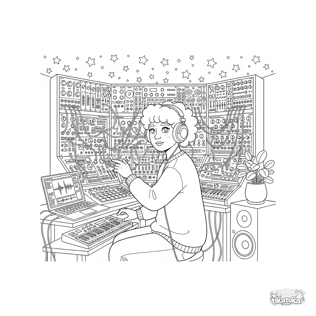 Página para colorear para niños de 10-12 años: un productor de música electrónica haciendo una canción en un sótano estudio. Detalles: sintetizador modular, cables, portátil, estrellas brillantes.