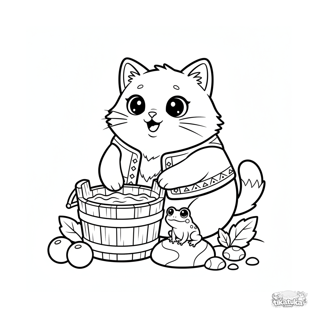 Página simple para colorear para niños pequeños 2-3: un gato parlante grande con chaleco junto al pozo. Cabeza enorme, formas simples, detalles mínimos.
