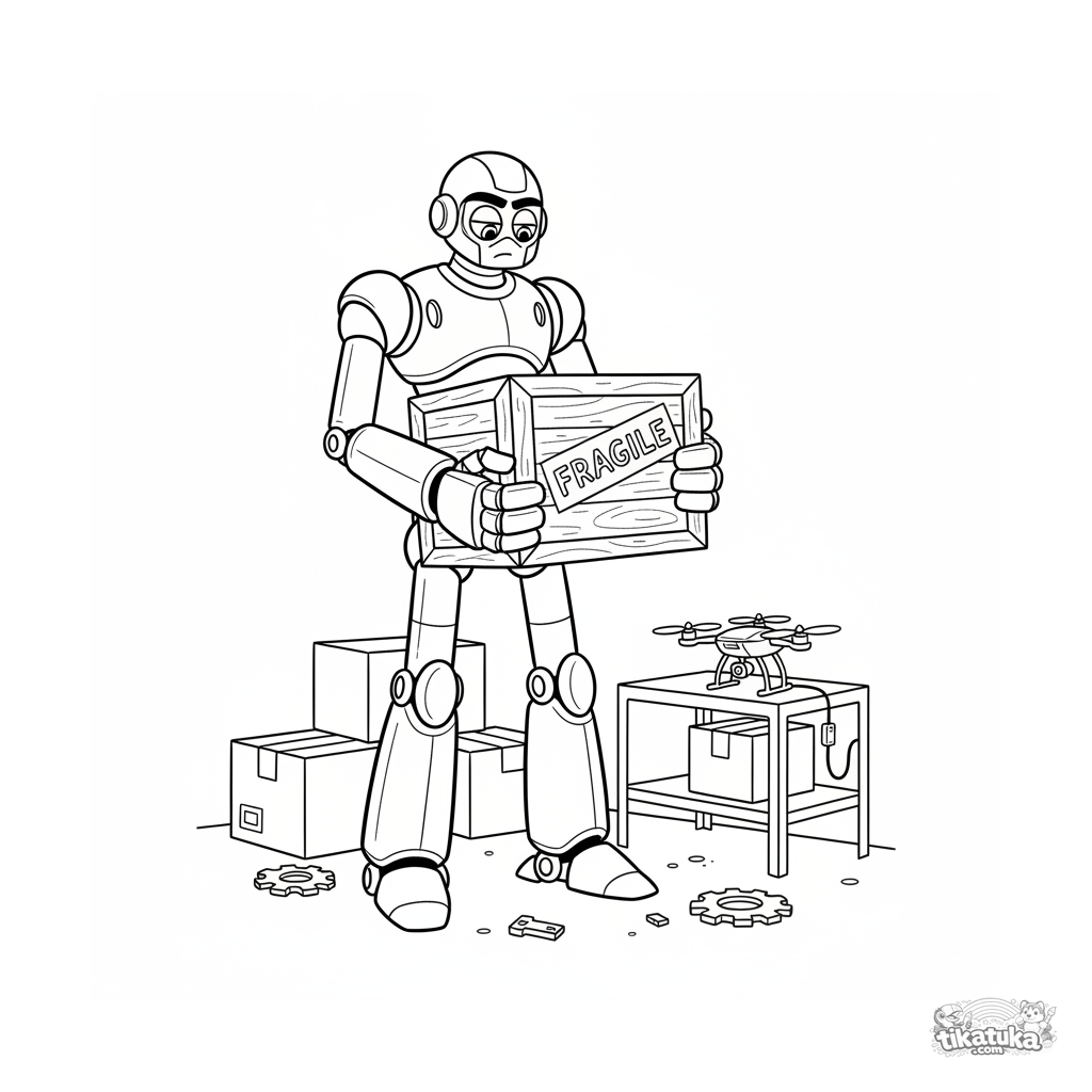 Página para colorear para niños de 7 a 9 años: un poderoso robot mecánico levanta una caja en un almacén. Pose dinámica, detalles hidráulicos.