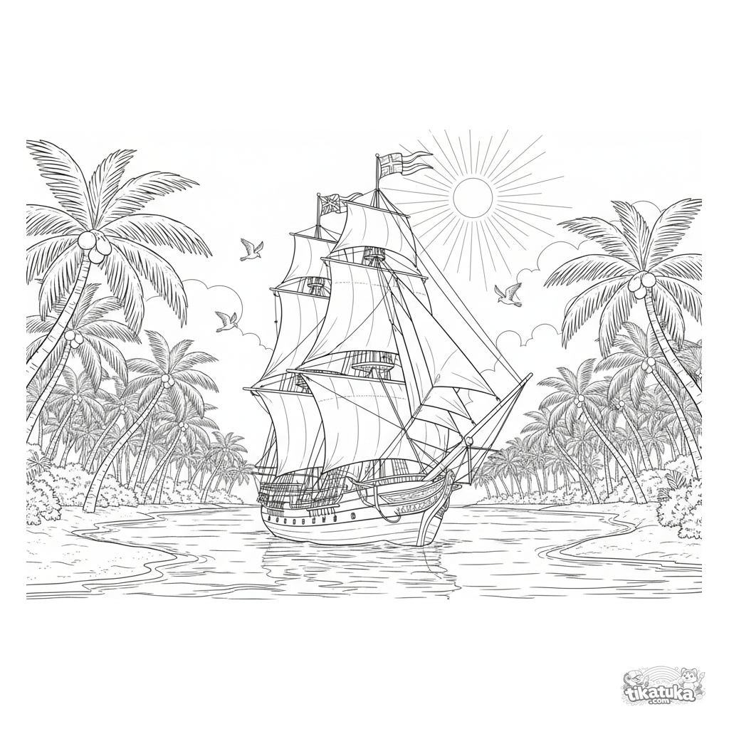 Página para colorear detallada para niños mayores de 10-12 años: un majestuoso velero entrando en una bahía tropical. Aparejos, velas y paisaje intrincados.