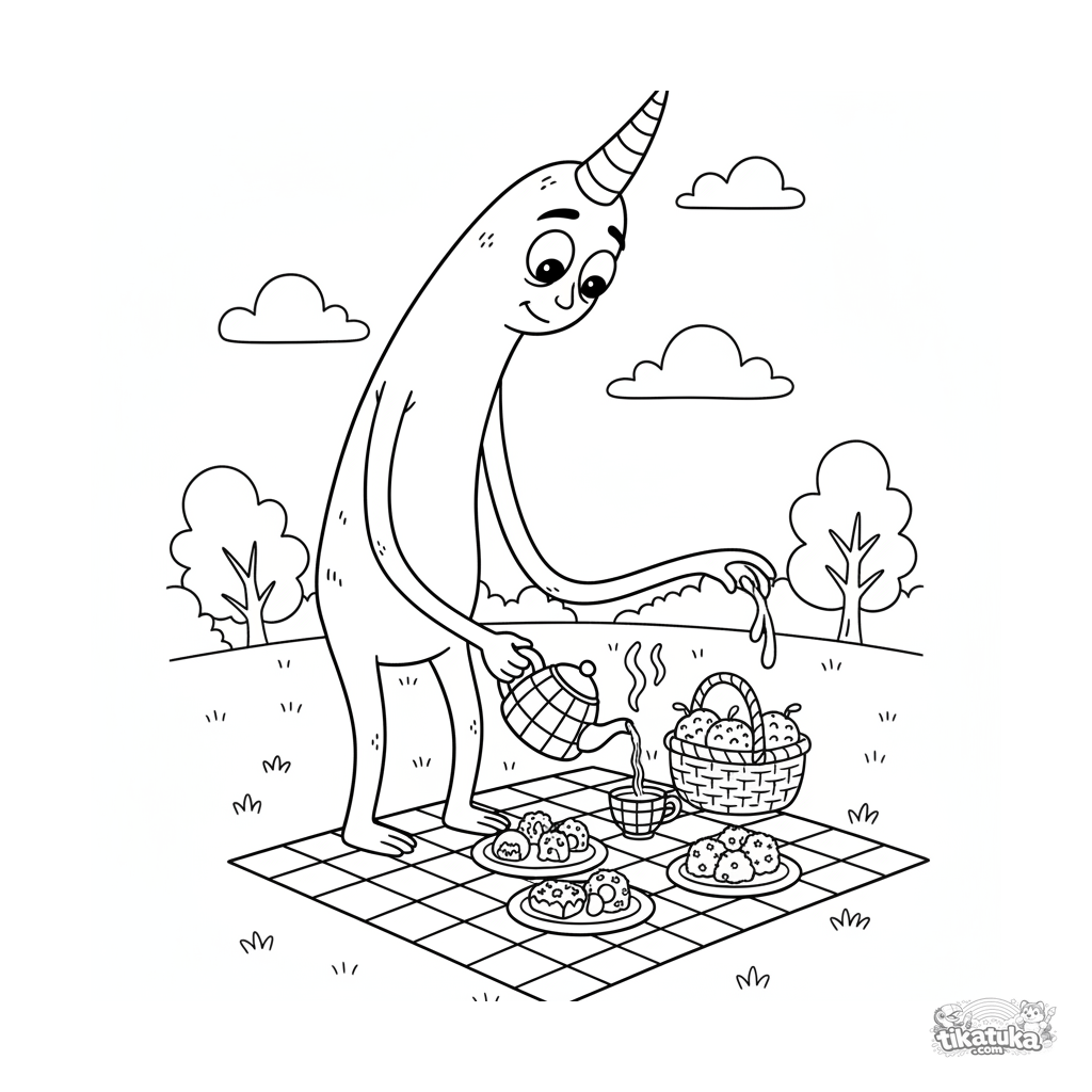 Página para colorear de un monstruo alto sirviendo té en un picnic con dulces de monstruo. Para niños de 7 a 9 años.