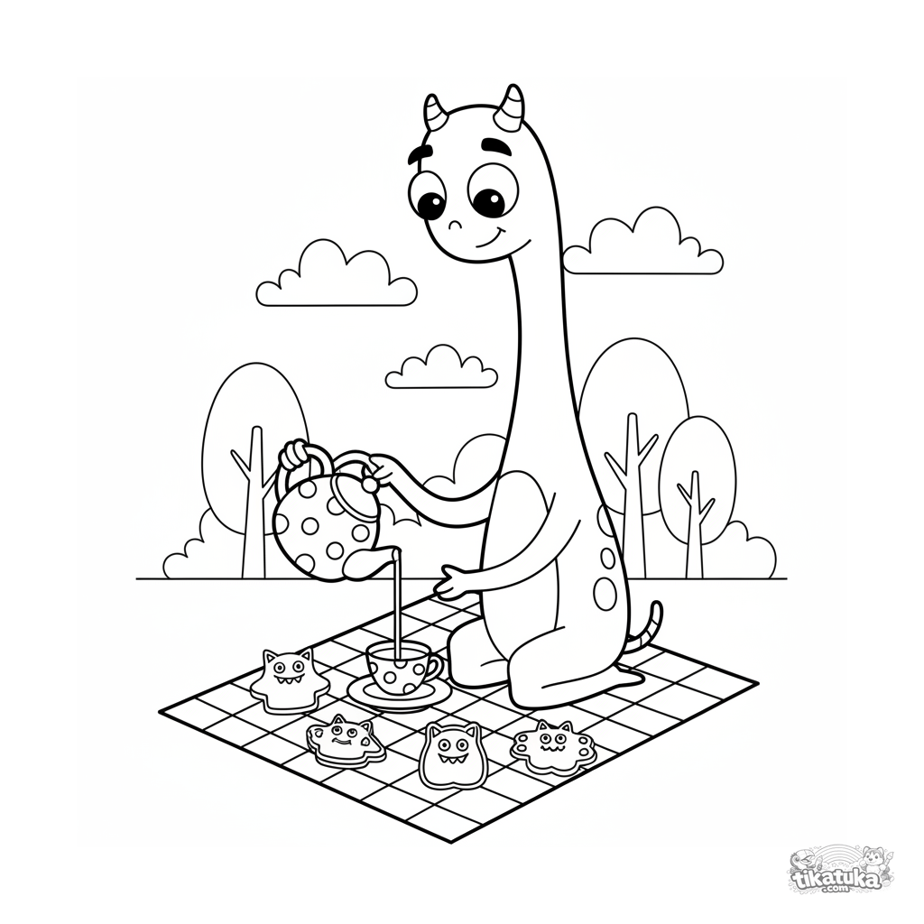 Página para colorear de un monstruo alto sirviendo té en un picnic. Para niños de 4 a 6 años. Incluye dulces con forma de monstruo.