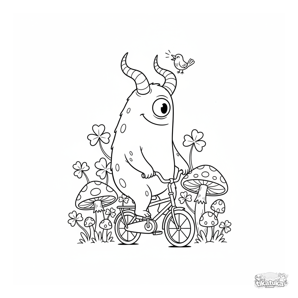 Página para colorear para niños: un monstruo alto con cuernos en espiral aprendiendo a montar en bicicleta en un campo de hongos. Escena divertida y amistosa.