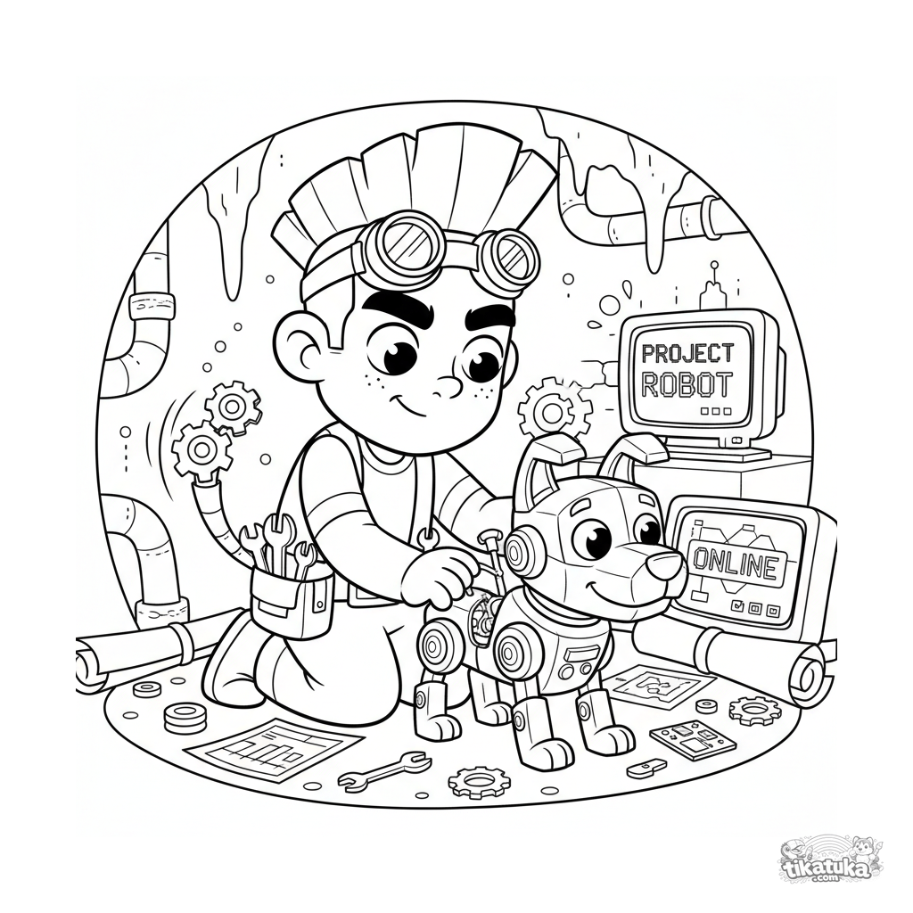 Página para colorear para preadolescentes 7-9: un superhéroe inventor con herramientas arregla a su leal perro robot en un laboratorio subterráneo secreto.