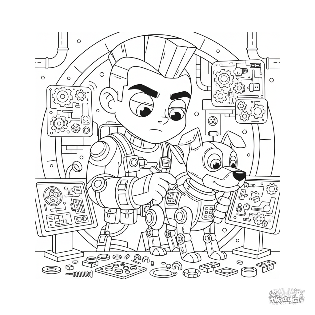Página para colorear para 10-12 años: un superhéroe inventor con herramientas repara un perro robot en un laboratorio subterráneo, rodeado de esquemas holográficos.
