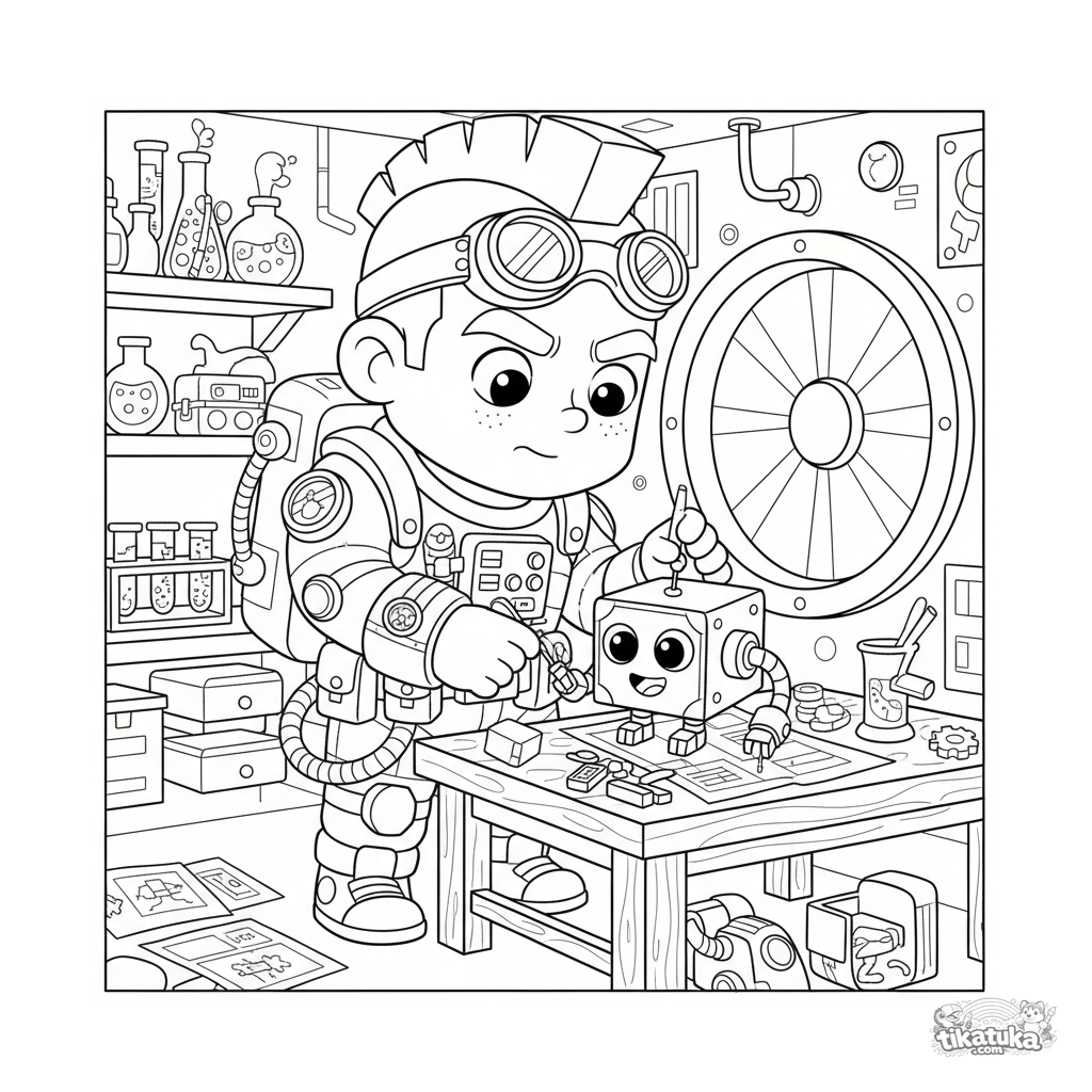 Página para colorear para preadolescentes de 7-9 años: un superhéroe inventor repara un pequeño robot compañero en un laboratorio subterráneo lleno de planos y piezas.