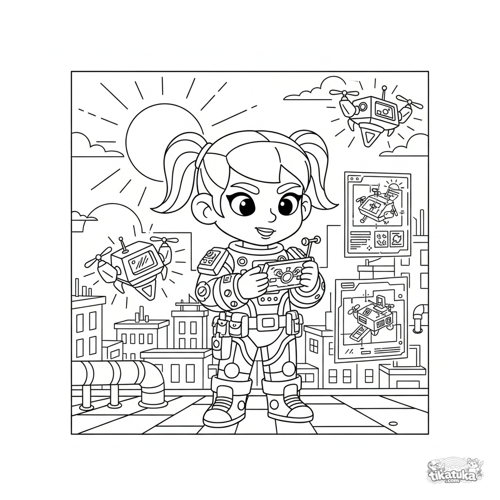 Página para colorear para preadolescentes 7-9: una superheroína inventora calibra sus drones ayudantes en un laboratorio en la azotea al atardecer.